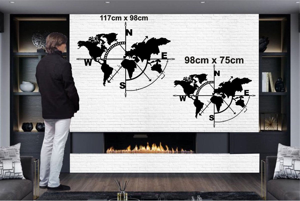 Wanddecoratie Wereldkaart Kompas Zwart 98x75cm